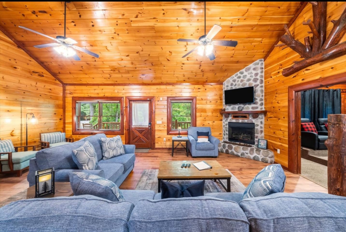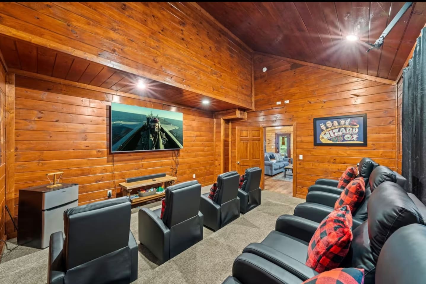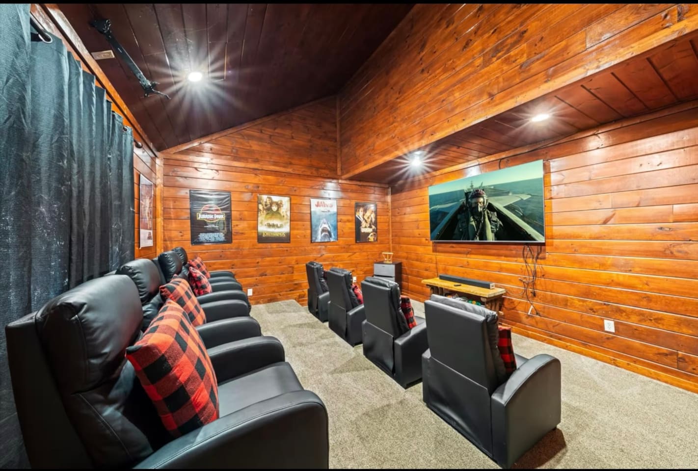 Tucked away in the heart of the Smokies, our stunning 2-story cabin, located in the exclusive Maranatha Resort, is where luxury meets adventure and is ONLY 5 minutes from the Cosby entrance to the Great Smoky Mountains National Park! Enjoy a private, peaceful retreat for your group while remaining just a short drive from Great Smoky Mountains National Park, Gatlinburg, Pigeon Forge, and other local mountain attractions. Whether you’re seeking outdoor adventure, family fun, or a quiet escape, this location provides the ideal setting for an unforgettable stay. With 6 spacious bedrooms and 6.5 bathrooms, this mountain retreat comfortably accommodates up to 18 guests—perfect for large families, multiple families, or group getaways. Inside, you’ll find room for everyone to relax and play—whether you’re catching a movie in the private theater room, challenging friends in the game room, or diving into fun in your very own indoor pool. Gather, unwind, and enjoy your stay in the Smokies—your mountain escape begins here! MAIN SPACES OF THE HOME: – 6 BEDROOMS & 6.5 BATHROOMS – BEDROOM 1 (Lower Level): * King-sized Bed * Smart TV * Nightstand & Lamps * Dedicated Workspace * Ensuite Bathroom BEDROOM 2 (Lower Level): * King-sized Bed * Smart TV * Nightstand & Lamps * Ensuite Bathroom BEDROOM 3 (Upper Level): * King-sized Bed * Smart TV * Nightstand & Lamps * Ensuite Bathroom BEDROOM 4 (Upper Level): * King-sized Bed * Smart TV * Nightstand & Lamps * Ensuite Bathroom BEDROOM 5 (Upper Level): * Full/Queen-sized Bed * Smart TV * Nightstand & Lamp * Ensuite Bathroom BEDROOM (Upper Level): * 2 Queen-sized Bunk Beds * Ensuite Bathroom – 6.5 BATHROOMS – * Ensuite Bathroom with a Tub & Walk-in Shower * Ensuite Bathroom with Walk-in Shower * Ensuite Bathroom with Walk-in Shower * Ensuite Bathroom with Shower/Tub Combo * Ensuite Bathroom with Walk-in Shower * Ensuite Bathroom with Shower/Tub Combo * Half Bathroom – GAME ROOM – * Pool Table * Air Hockey * Poker Table * Arcade Games – MOVIE THEATER – * 8 Reclining Chairs * Popcorn Machine * Smart TV – CHEF’S KITCHEN – * Fully Stocked * High-end Stainless Appliances * Large Refrigerator * Ample Cabinetry & Cooking Space * Coffee Maker – MAIN LIVING ROOM – * Smart TV * Indoor Fireplace * Large Plush Sofa * High Ceiling * Open Floor Plan – OUTDOOR FUN & AMENITIES – * Expansive Deck w/ Stunning Views * Indoor Heated Pool ($100/night) * Hot Tub * Fire Pit * BBQ Grill
