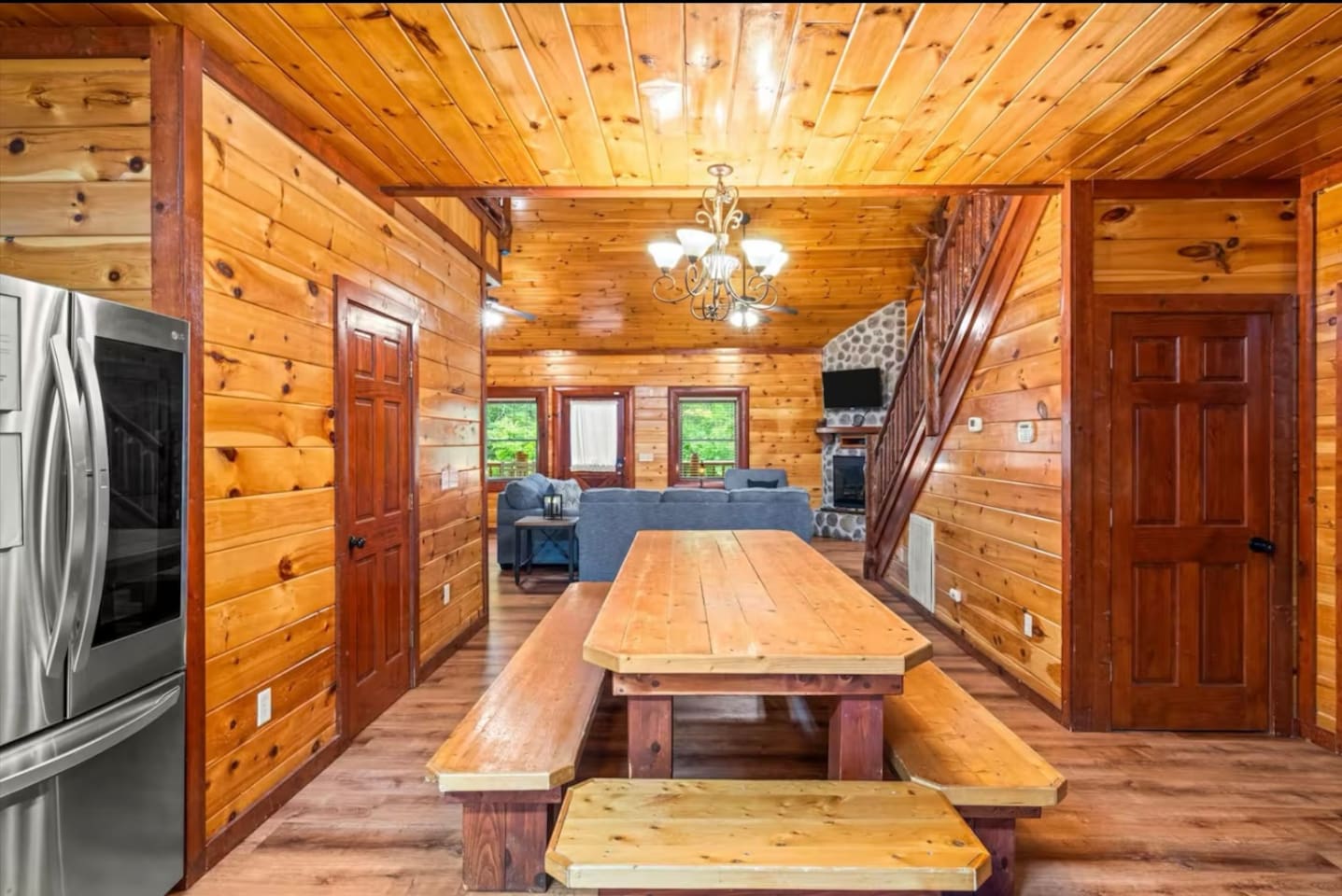 Nearby Attractions: Hen Wallow Falls – 6 miles away A scenic 90-foot waterfall reached by a moderate 4.4-mile hike through lush forest—perfect for a peaceful nature escape. Lower Mount Cammerer Trailhead – 7 miles away This challenging trail leads to a historic fire tower with sweeping mountain views—great for experienced hikers. Maddron Bald Trail – 10 miles away Hike through an old-growth forest with access to the Appalachian Trail. A hidden gem for outdoor lovers. Foothills Parkway (Cosby entrance) – 4 miles away A picturesque drive with panoramic Smoky Mountain views, ideal for sightseeing and sunset photo stops. Cosby Nature Trail & Picnic Area – 5 miles away A short, family-friendly trail loop with picnic tables and a peaceful forest setting—great for little ones or a casual stroll. Smoky Mountain Llama Treks – 3.3 miles away A fun activity where you can hike with llamas—perfect for families or anyone wanting a unique outdoor experience. Restaurants: Carver’s Orchard & Applehouse Restaurant – A charming orchard setting with Southern-style comfort food, apple pies, and an on-site market with fresh produce and homemade goods. Docs 321 Café & Marketplace – A fun and quirky local café in a converted school bus serving BBQ, sandwiches, chili, and fresh lemonade. Janice’s Diner – A cozy spot for hearty breakfasts, burgers, and homestyle meals served with Southern hospitality. D J’s Market & Deli – A casual stop for tasty sandwiches, cheesesteaks, and quick bites in a small-town deli setting. Two Guys & BBQ / Fowl Play Chicken & BBQ Barn – Local BBQ favorites serving up generous portions of smoked meats, chicken, and savory sides.